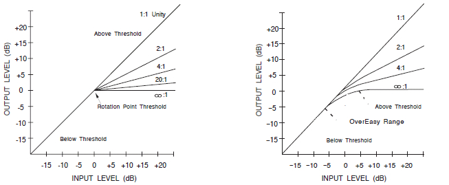 左がOverEasyON、左がOFF。スレッショルド前後が曲線になっていて、いとも簡単にごまかすことができます。ちなみにVSTプラグインのコンプでは殆どついてるといってもいい標準的な機能で、設定するときだけOFFで、大体設定が決まったらONにして構わないと思います。その後更に微調整で。